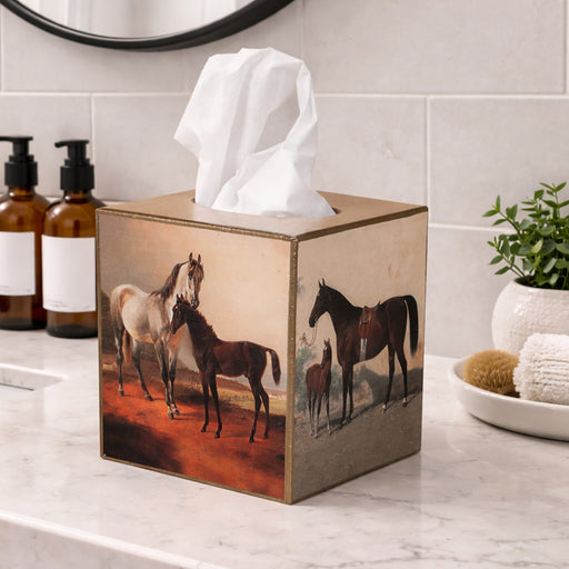 Original price $44.95 - Original price $44.95Original price$44.95$44.95 - $44.95Current price $44.95Equestrian tissue box cover features 19th-century images of mares and foals. Two different images circle the basket: a grey mare with a dark bay fo...
