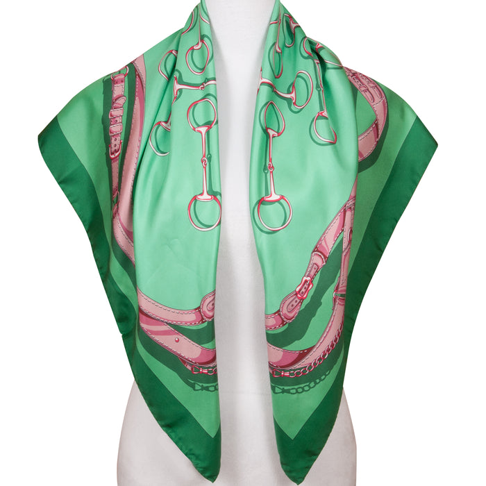 This fabulous equestrian themed silk scarf in racing green is just the perfect accessory for your exciting day at the racetrack. Crafted in Italy to the highest specifications. Bold design of snaffle bits in the center surrounded by bridle bits border. The racing green background is bordered by a darker green. Accented with dusty pink leathers and off-white snaffle bits. Creating the perfect fashion accessory for spring and summer. Truly a wearable work of art and a remarkable gift for the equestrian.